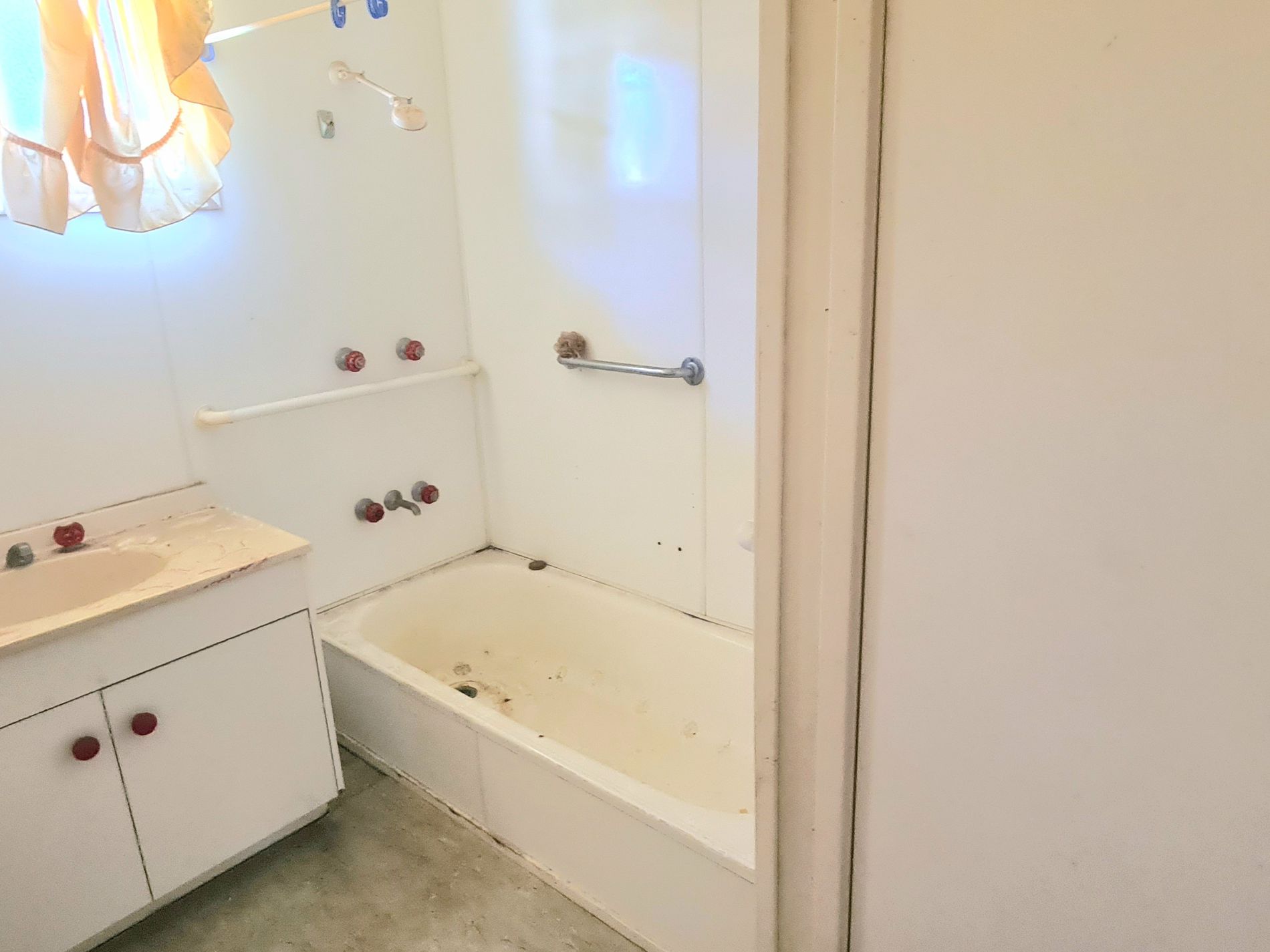 Bathroom with vanity, storage, and shower over bath.
