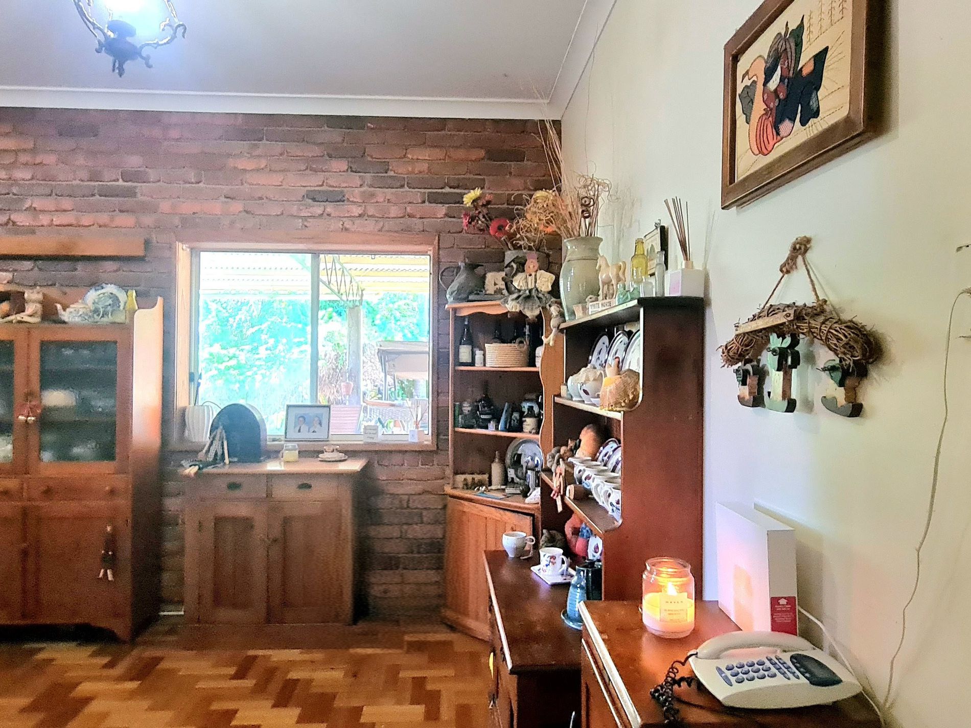 Country-style kitchen with brick feature walls, hardwood timber flooring, and decorative ceiling timber beams.