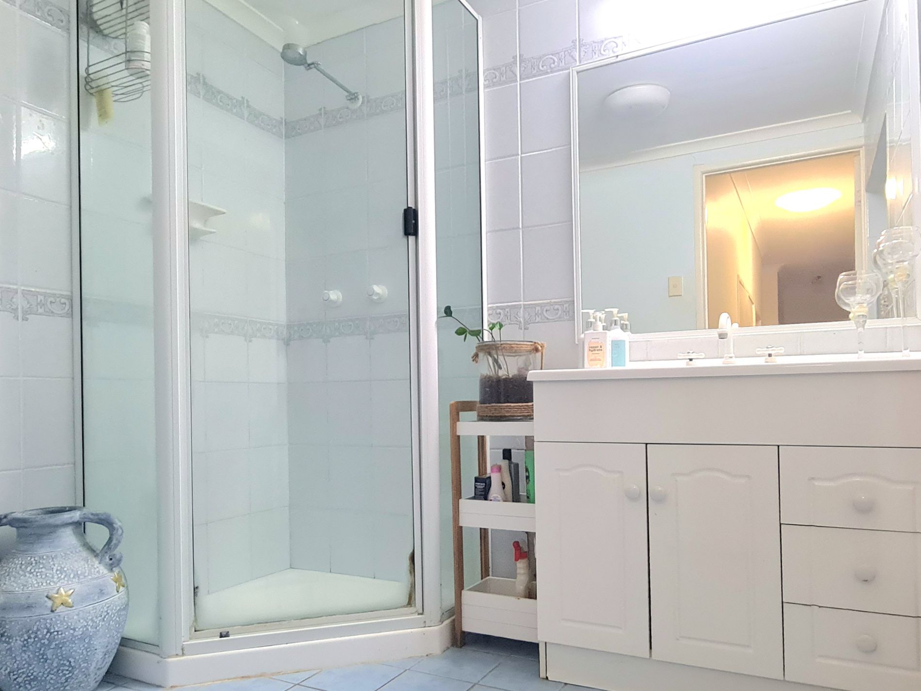 Bathroom with vanity, storage, and shower over bath.